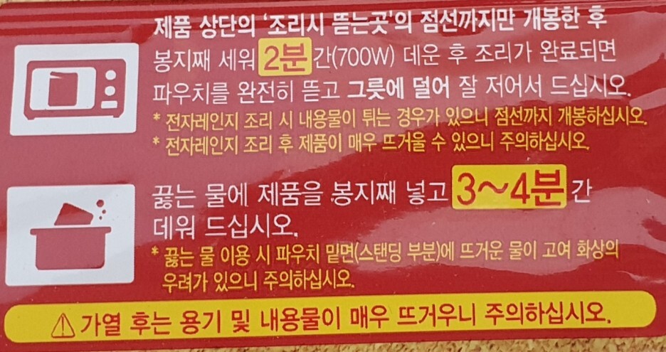 끓는 물에 제품을 봉지째 넣고 3~4분간 데워 드십시오.