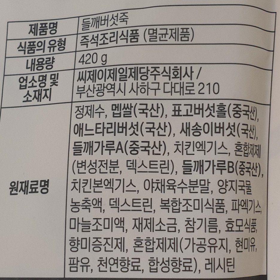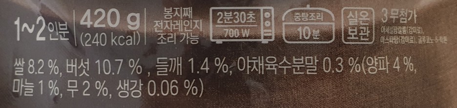 쌀 8.2%, 버섯 10.7%, 들깨 1.4%, 야채육수분말 0.3%(양파 4%, 마늘 1%, 무 2%, 생강 0.06%)
