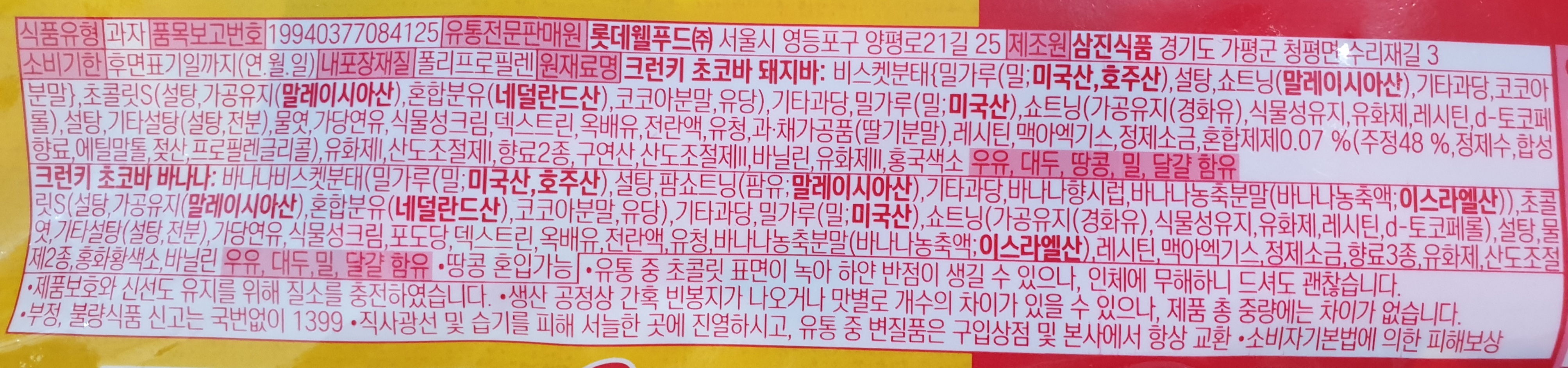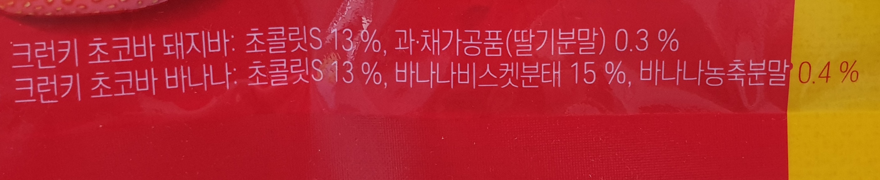 - 크런키 초코바 바나나 : 초콜릿S 13%, 바나나비스켓분태 15%, 바나나농축분말 0.4%