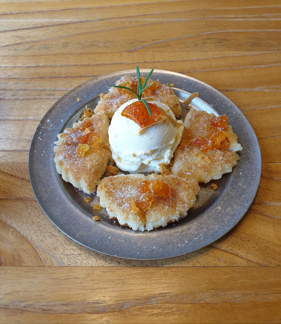 지름떡은 가운데 아이스크림 토핑, 떡 위에는 귤 토핑이 올라가 있었습니다