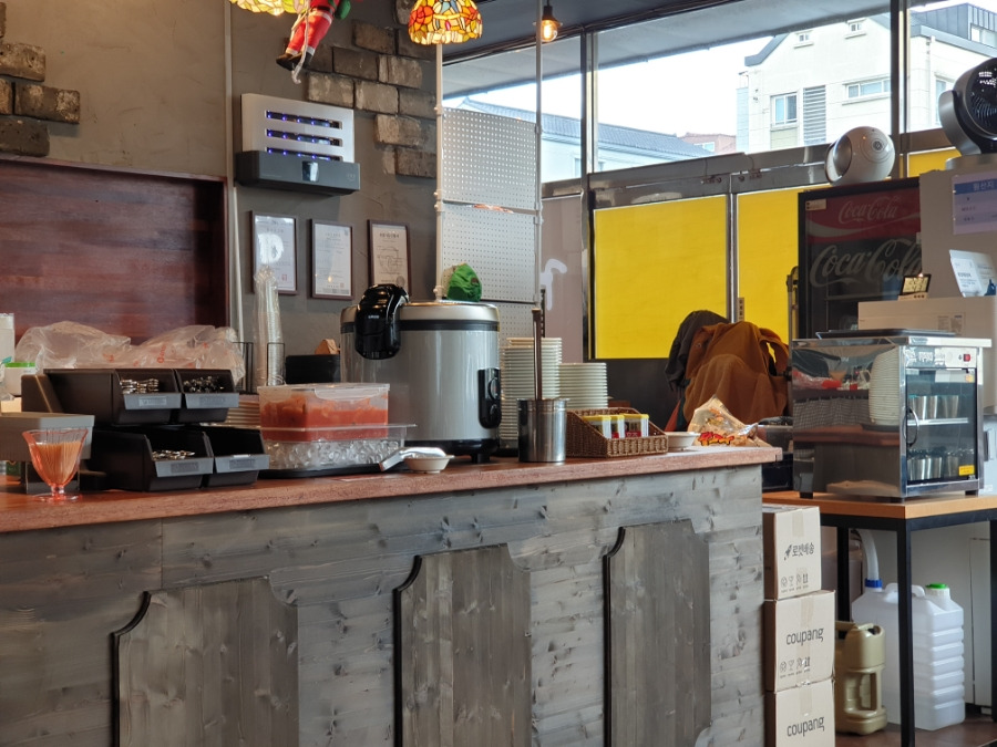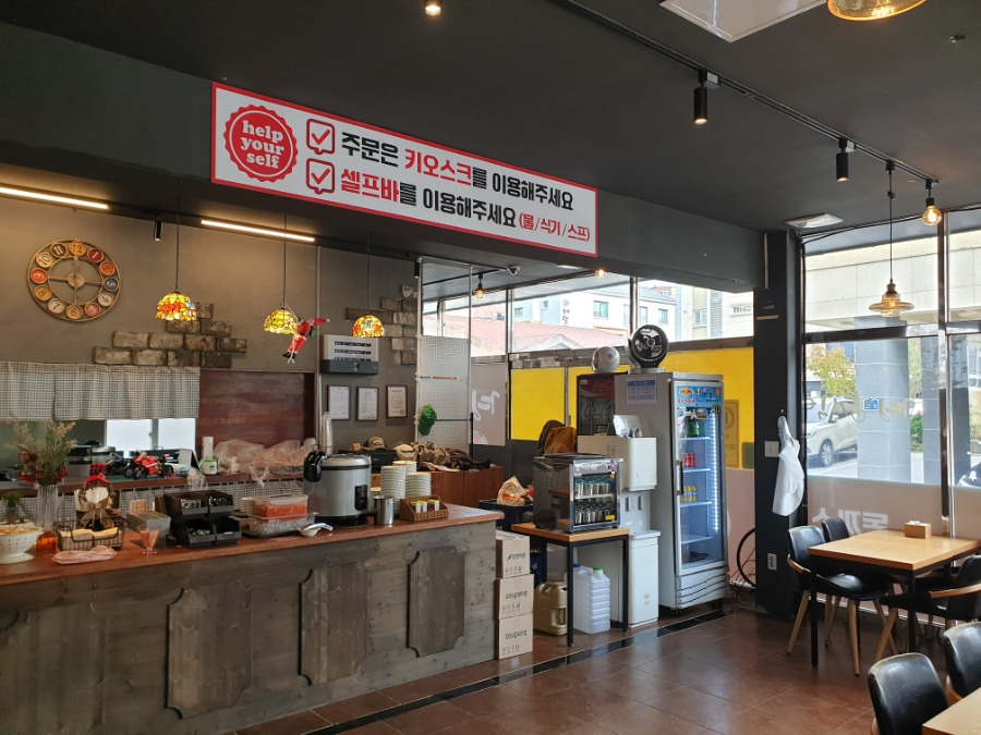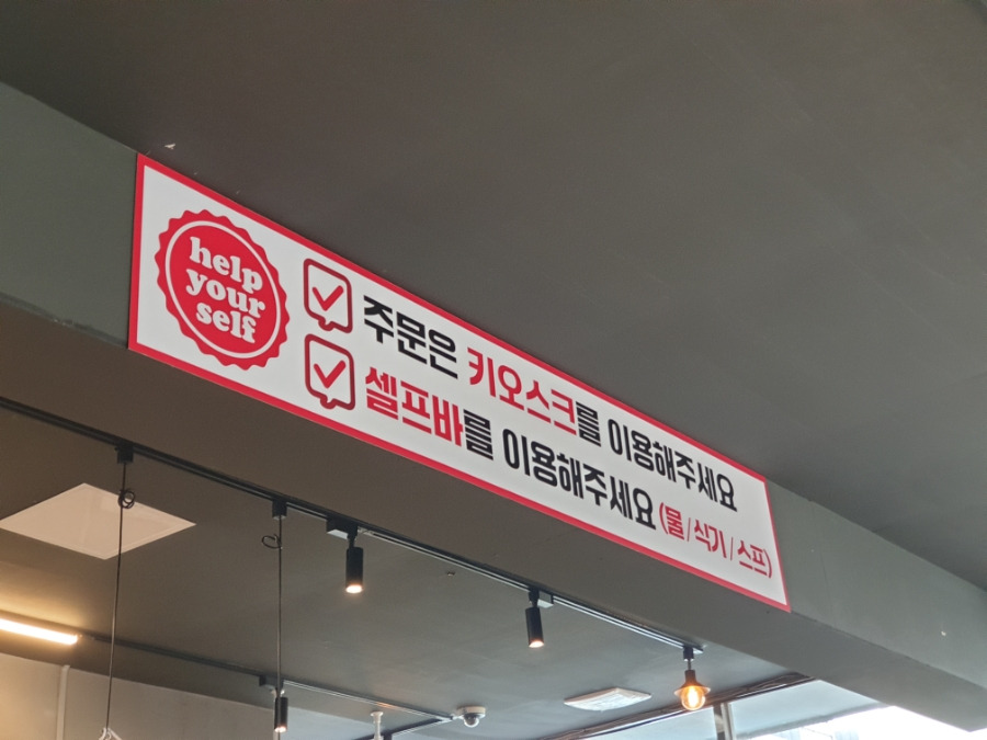 셀프바에서 물, 식기, 스프, 깍두기를 가져오면 됩니다