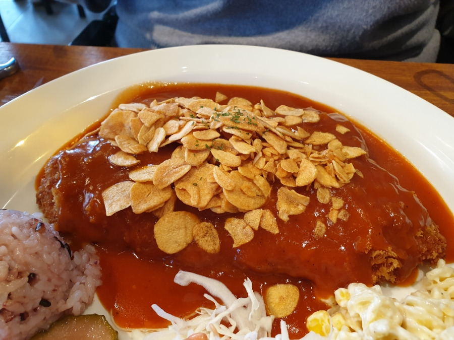 돈까스는 먹다보면 좀 물릴 수 있는데, 매콤한 소스와 갈릭 후레이크가 그런 부분을 어느정도 커버해주는 느낌이었습니다