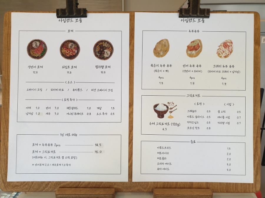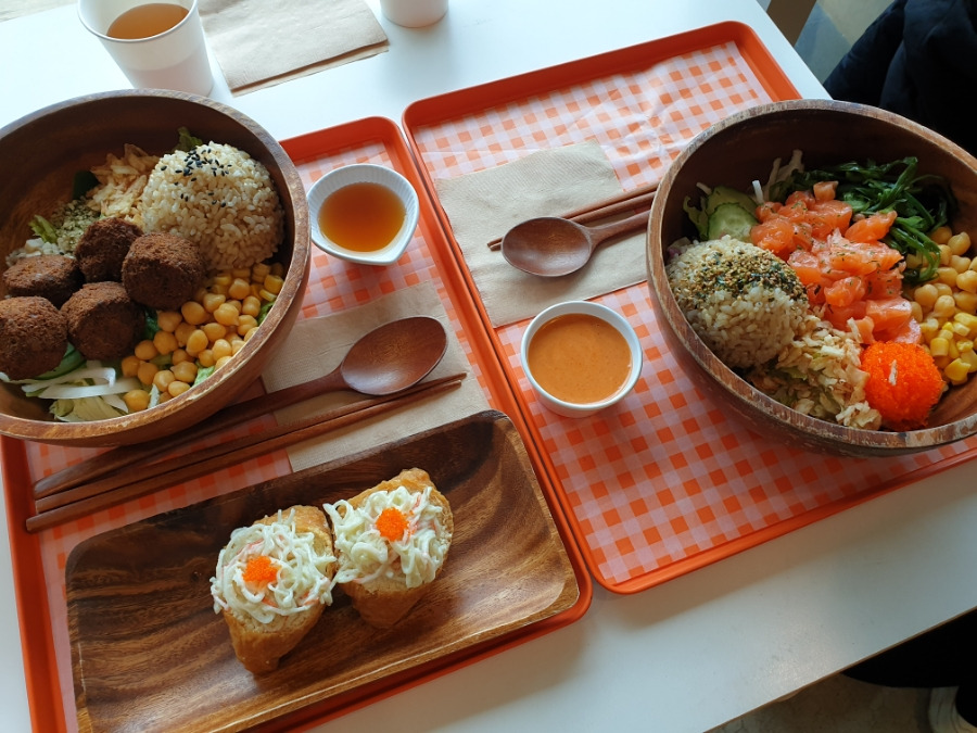 생연어포케, 팔라펠포케, 크래미 두부 유부를 주문했습니다(하나는 1인 세트메뉴로 주문했습니다)