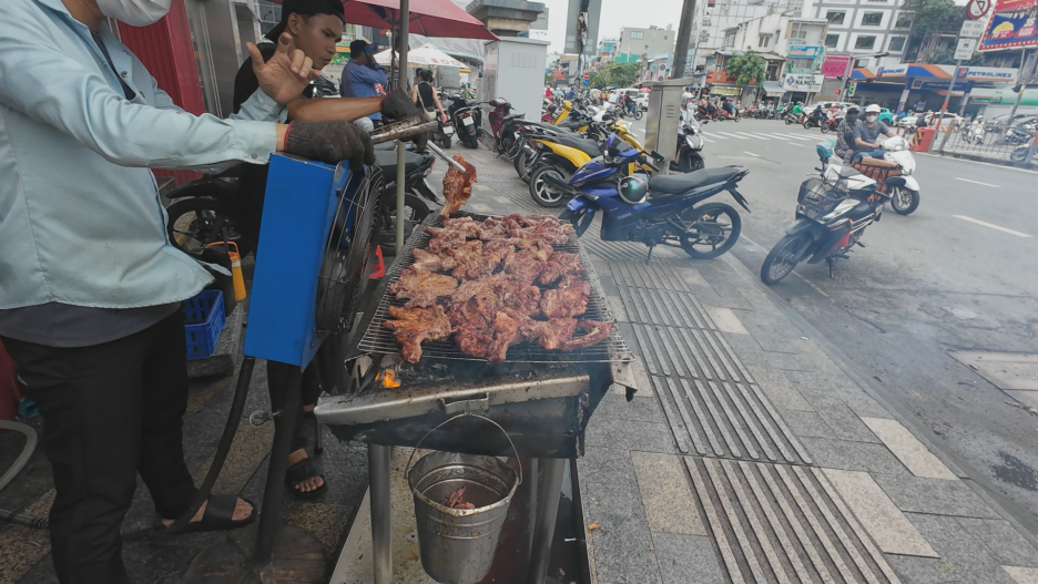 가게 입구에서는 밥 위에 올라가는 고기를 굽고 있는 모습입니다