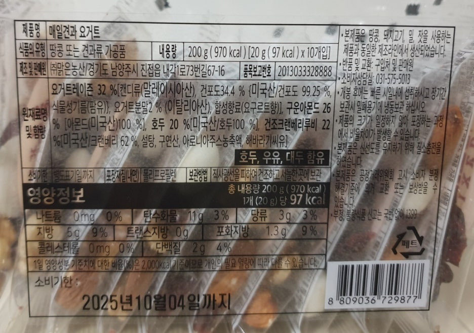 이번에 먹어본 음식은 매일견과 요거트 입니다.