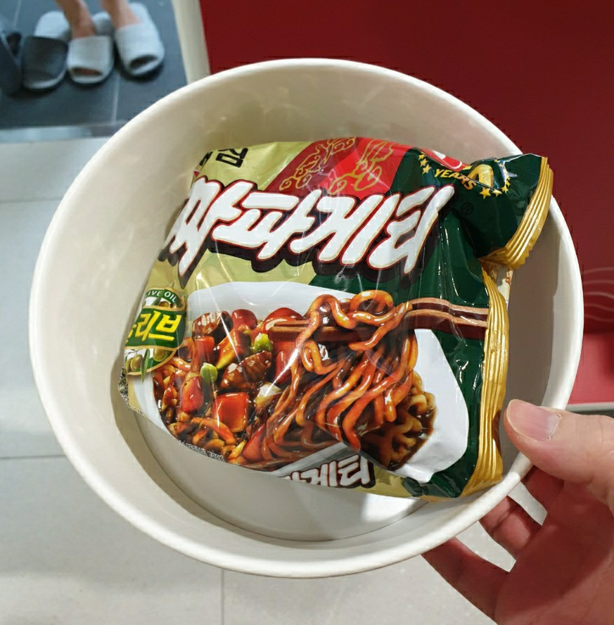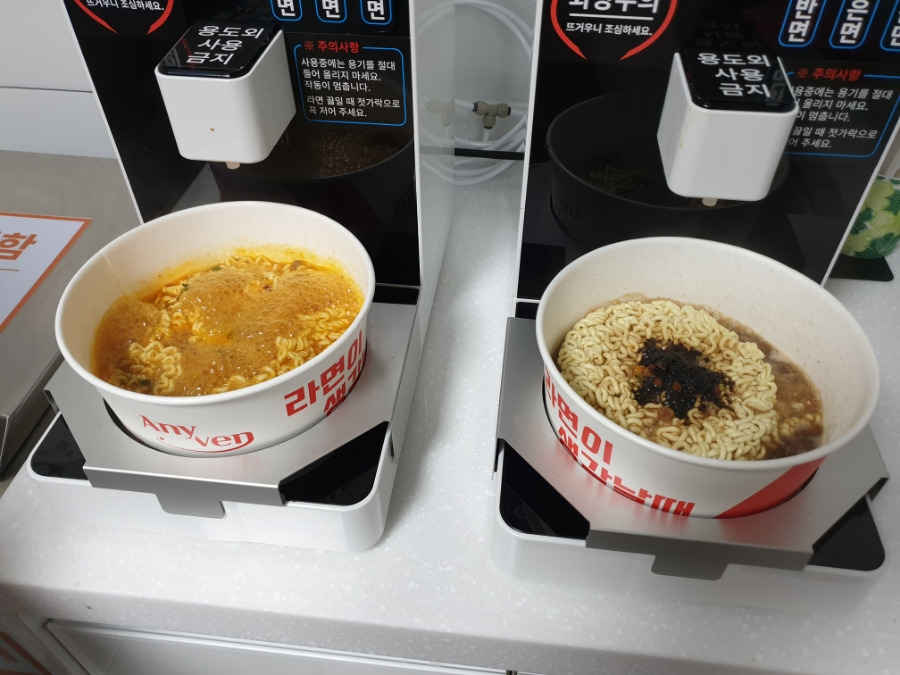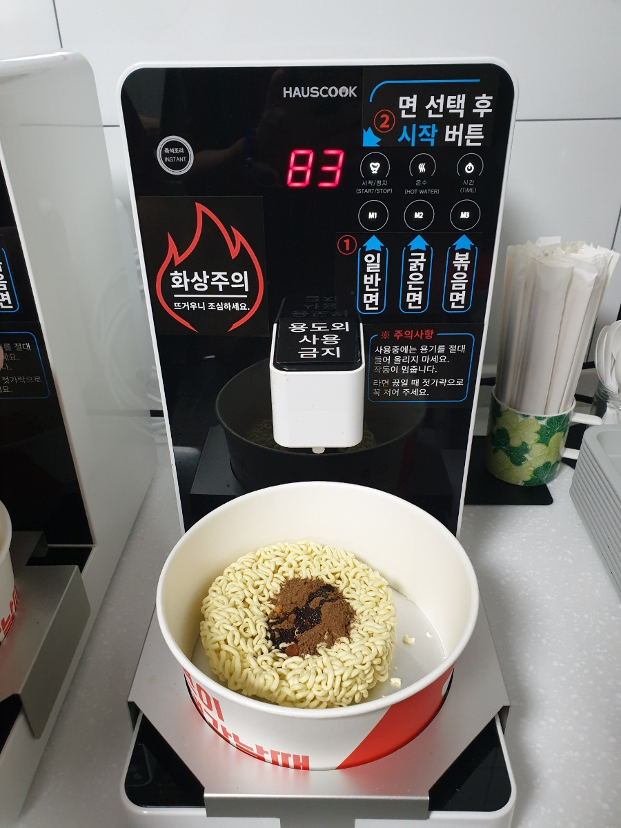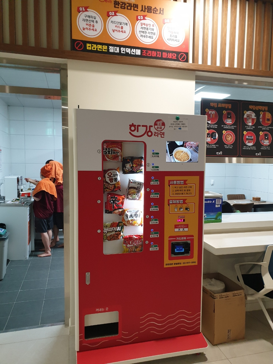 자판기에서 원하는 라면을 구매하면, 그릇와 라면이 나옵니다