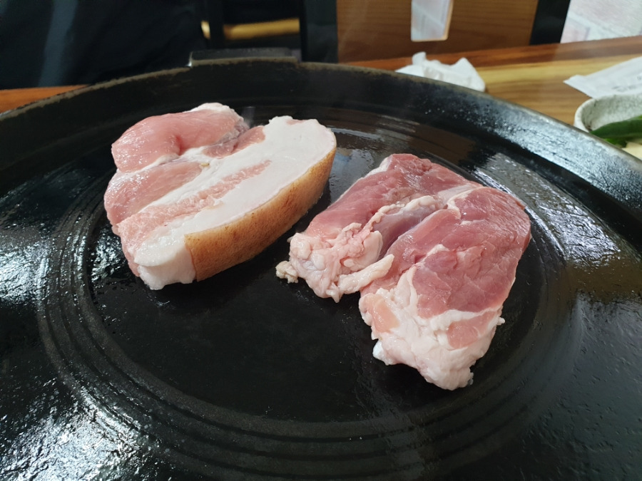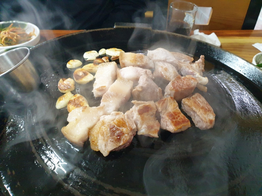 반짝반짝 기름칠이 되어 있는 솥뚜껑에 고기를 구워 먹습니다