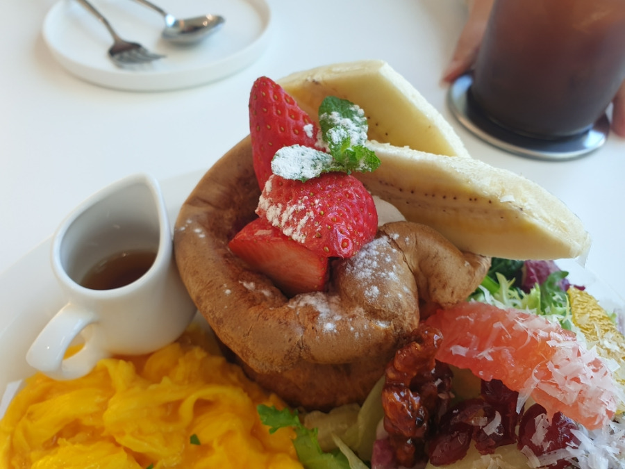빵위에 딸기와 바나나가 있어서 같이 먹기 좋았고, 왼쪽에있는 메이플 시럽을 부어서 먹으니 달달하고 맛있었습니다