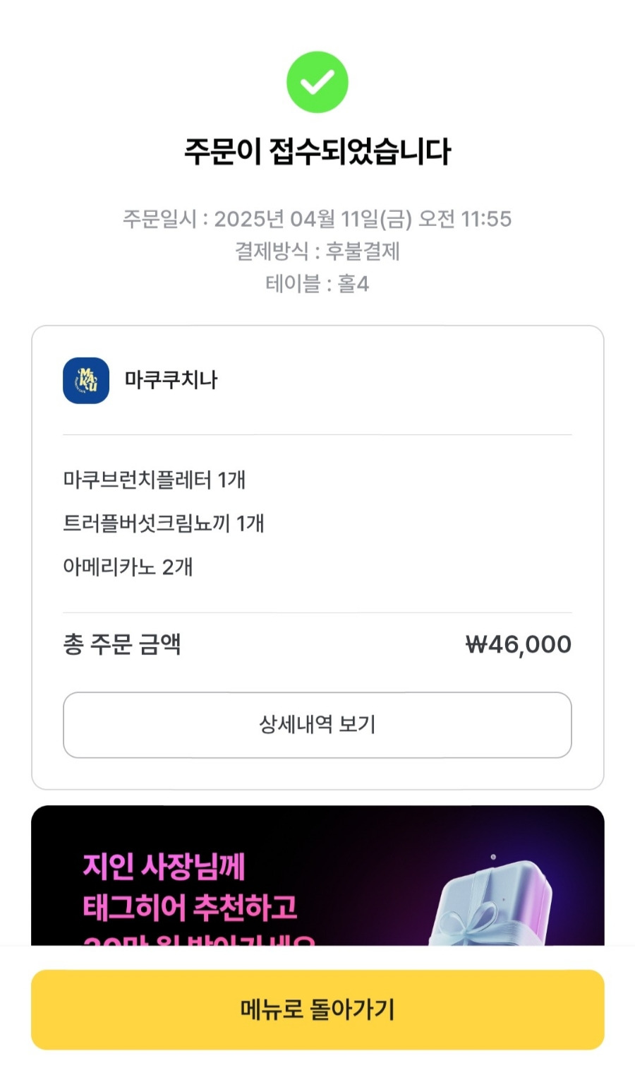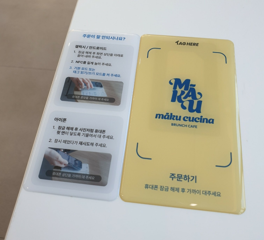여기는 주문 방법이 아주 특별했는데, 노란 부분에 핸드폰을 대고나서, 핸드폰을 통해서 주문을 진행하면 됩니다