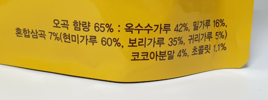 오곡 함량 65% : 옥수수가루 42%, 밀가루 16%