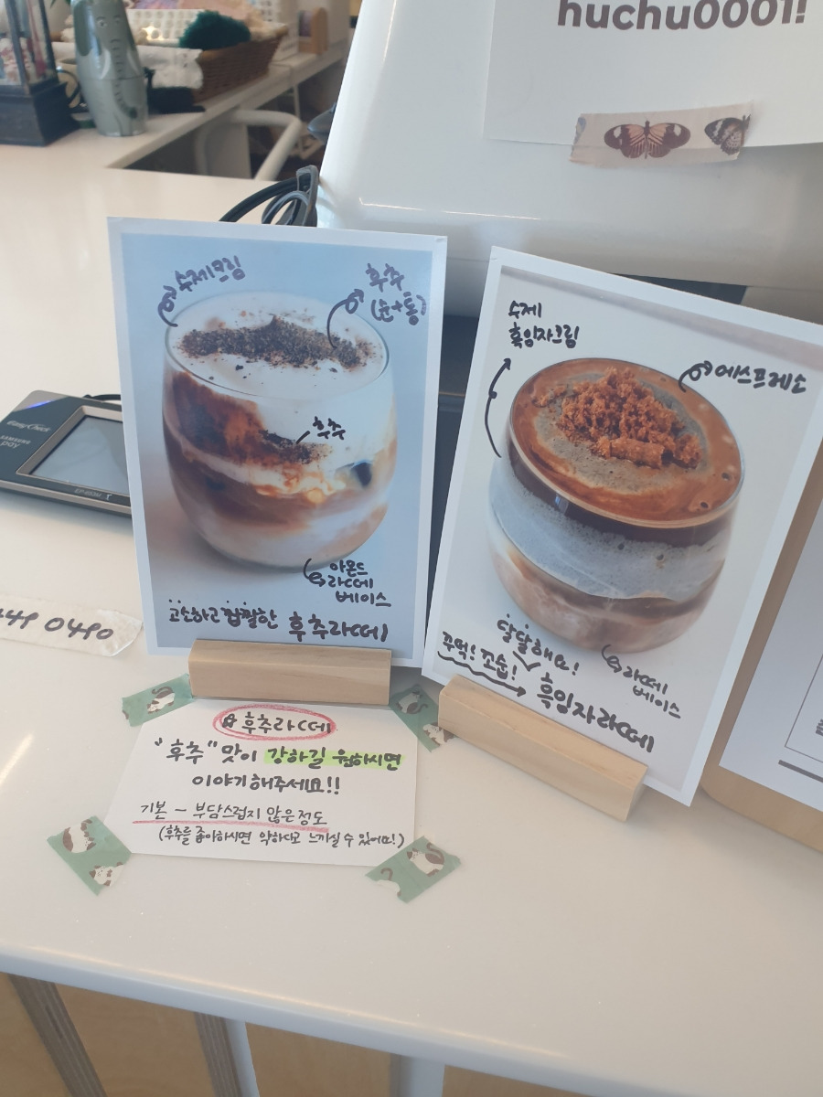 맨 위에 있는 후추라떼와 모든 디저트가 수제인 것이 눈에 띄네요