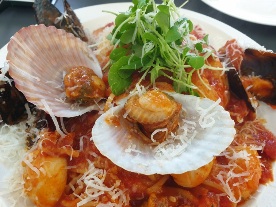 해산물이 풍성하게 들어 있어서 좋았고, 토마토 소스는 진하면서도 신맛이 비교적 강하게 느껴져서 입맛이 확 돌았습니다