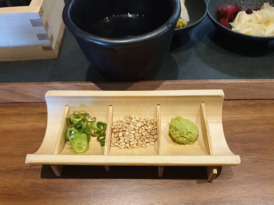 밥위에 취향에 맞게 파, 깨, 고추냉이를 올려서 먹으면 됩니다