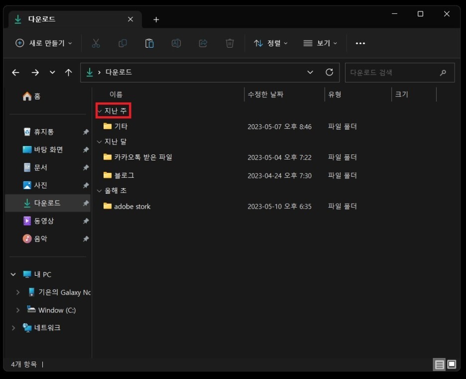 윈도우 11 다운로드 폴더 기간별 구분 해제 방법 다운로드 폴더를 보시면 기간별로 폴더가 분류되어 있는 것을 확인할 수 있습니다. 저같은 강박증 환자는 보기 매우 거슬리네요. 기간별 분류를 해제해보겠습니다. [정렬]을 클릭합니다. [분류방법]을 클릭 합니다. [없음]을 클릭합니다. 기간별 구분이 사라진 것을 확인할 수 있습니다. 이상으로 포스팅을 마치겠습니다~! IT 2023.05.10