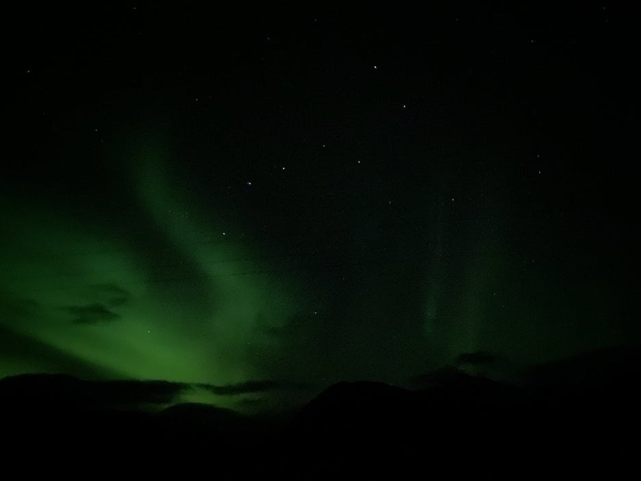 육안으로는 오로라가 잘 보이지 않았지만, 카메라로 촬영하니 오로라가 선명하게 보이기 시작했습니다!