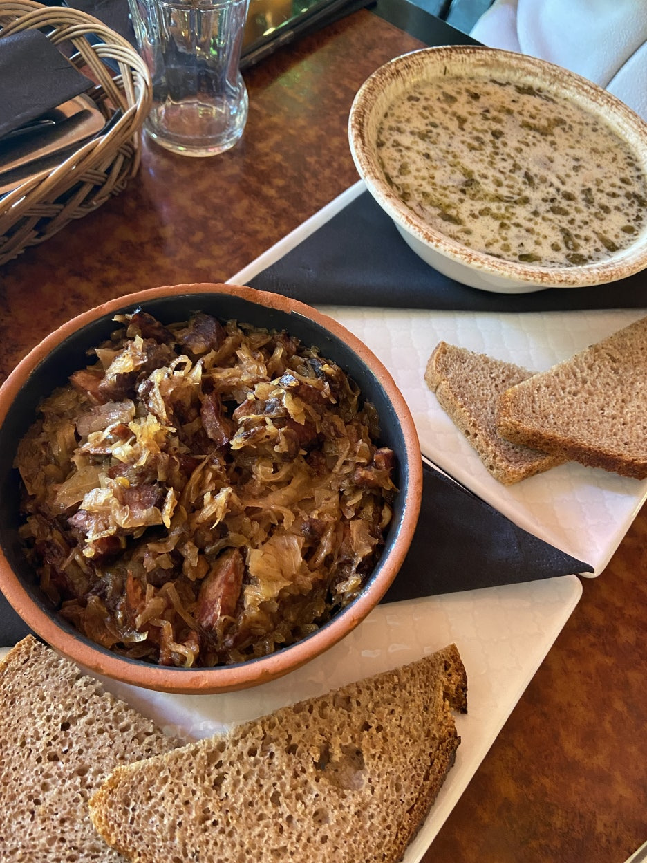 위쪽 음식이 폴란드식 수프인 주렉이고, 아래쪽이 비고스라는 음식입니다