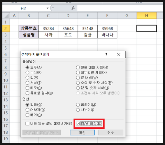 3. 행/열 바꿈을 체크한 뒤 확인