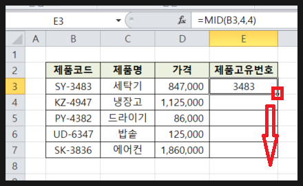 MID 함수를 활용하여 제품코드에서 제품의 고유번호만 추출해보겠습니다.