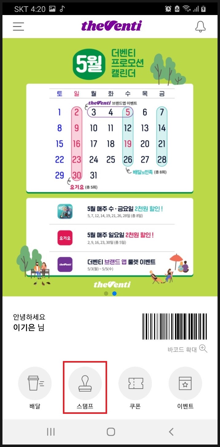 메인 화면에서 스탬프를 터치 합니다.