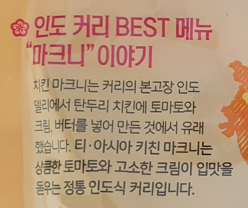 휘핑크림 21%, 닭고기 8%, 토마토페이스트 4%, 가람마살라 0.75%, 순카레분 0.01%