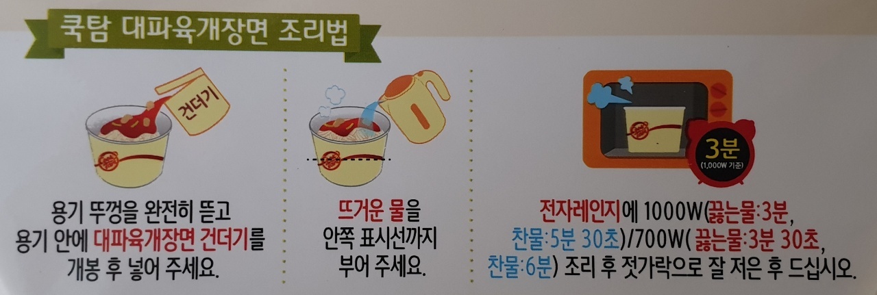 3. 전자레인지에 1000W(끓는물: 3분, 찬물: 5분 30초) / 700W(끓는물 3분 30초, 찬물 6분) 조리 후 젓가락으로 잘 저은 후 드십시오.